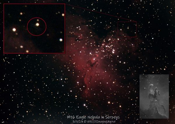 M16 (the Eagle Nebula/Pillars of Creation) is 7,000 light years away. It is located near the ecliptic plane (the path the sun and planets take across the sky) in constellation Serpens. Sometimes comets and asteroids can drift thru the sky area and the camera’s field of view. Imaged on Aug. 23, 2023, the final color image was 2.3 hrs. (300s subs x 27) with no filter. Stacked images can show short streaks. After animating 30 images, the object’s movement was noticed and visible against the nebula and stars which are much further away in the background. Don't know the name, but its movement was captured for about 2.5 hrs...
